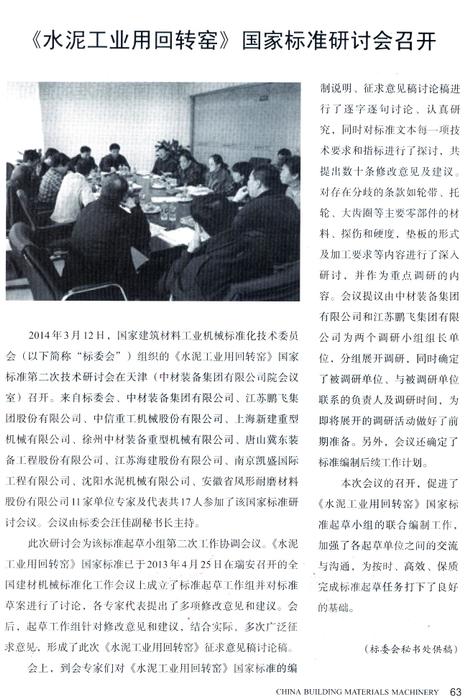 2014年3月12日,國家建筑材料工業(yè)機(jī)械標(biāo)準(zhǔn)化技術(shù)委員會組織的國家標(biāo)準(zhǔn)第二次技術(shù)研討會在天津召開。江蘇鵬飛集團(tuán)股份有限公司等11家單位專家及代表共17人參加了該國家標(biāo)準(zhǔn)研討會議。