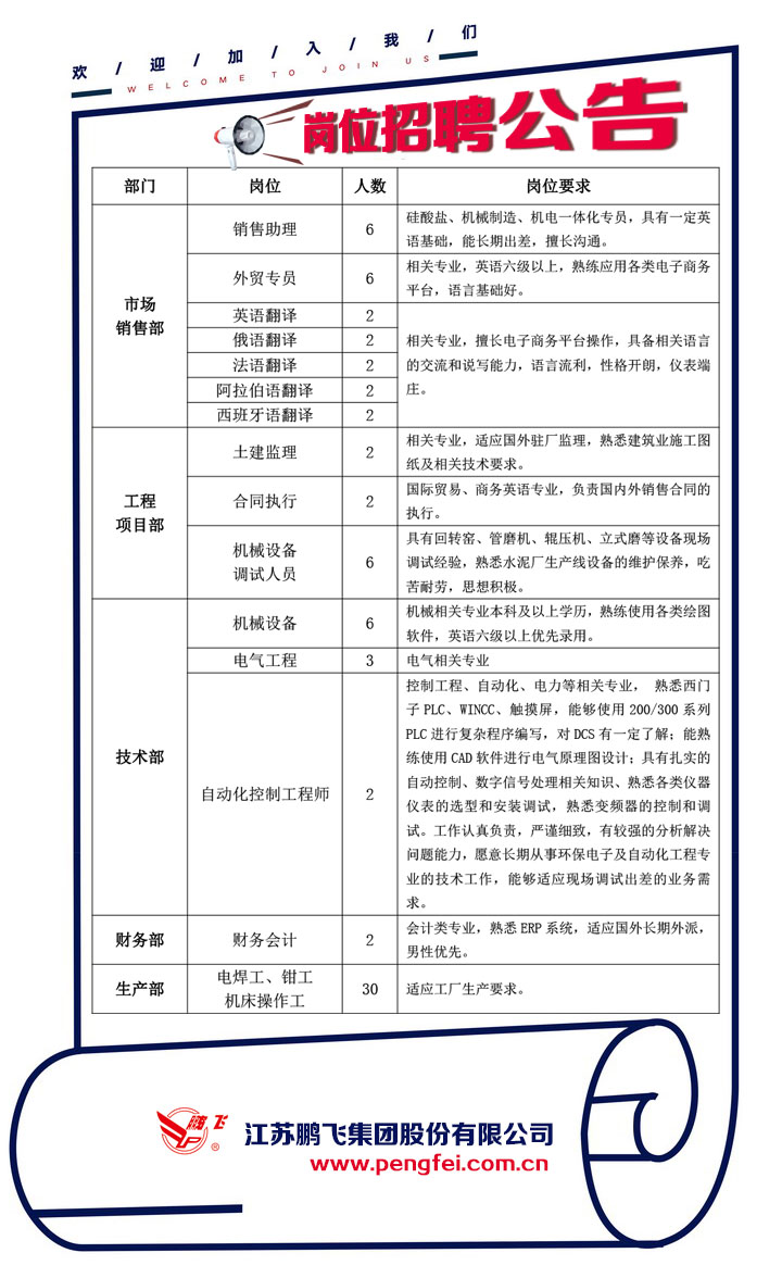 公司因發(fā)展需要,面向社會(huì)招聘以下職位人員,請(qǐng)直接電話(huà)聯(lián)系或者到公司面試洽談。