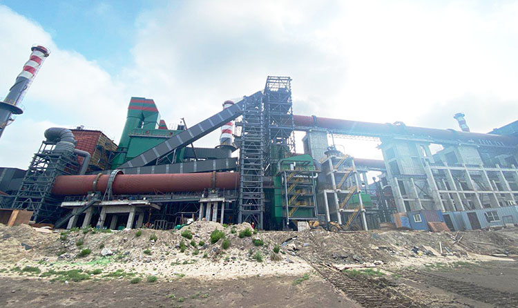 圖片為年產(chǎn)100萬(wàn)噸鎳鐵合金二期工程安裝現(xiàn)場(chǎng),鵬飛集團(tuán)提供Φ5.5×115m鎳鐵焙燒回轉(zhuǎn)窯和Φ5×50m烘干回轉(zhuǎn)窯生產(chǎn)制造。