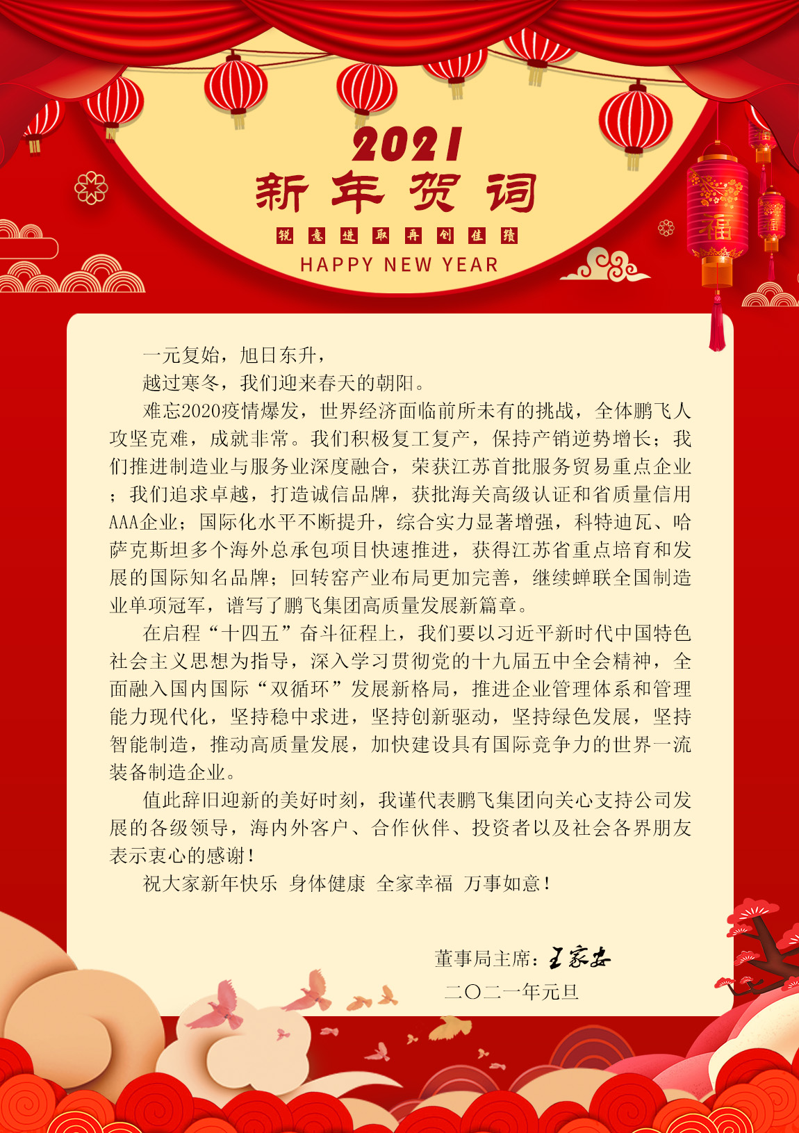 值此辭舊迎新的美好時(shí)刻,我謹(jǐn)代表鵬飛集團(tuán)向關(guān)心支持公司發(fā)展的各級領(lǐng)導(dǎo),海內(nèi)外客戶、合作伙伴、投資者以及社會各界朋友表示衷心的感謝!