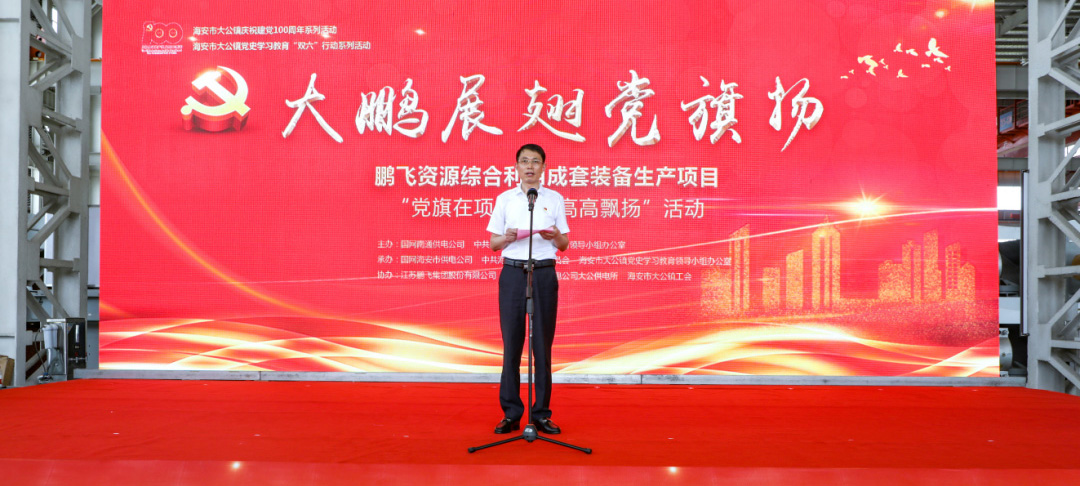 鵬飛資源綜合利用成套裝備生產(chǎn)項目是南通市第一批“黨旗在項目一線高高飄揚”啟動項目,由國網(wǎng)南通供電公司掛鉤聯(lián)系。“國網(wǎng)南通供電公司黨委把開展黨史學習教育作為一項重大政治任務(wù),發(fā)揮優(yōu)勢、凸顯特色,推動黨史學習教育與項目建設(shè)、服務(wù)企業(yè)辦實事等重點工作深度融合,做到建強堡壘,黨旗飄在項目一線;舉旗亮徽,黨員沖在項目一線設(shè)崗定責,服務(wù)下沉項目一線。”國網(wǎng)南通供電公司副總經(jīng)理李秋實介紹如何國網(wǎng)公司將服務(wù)下沉項目一線時說道。