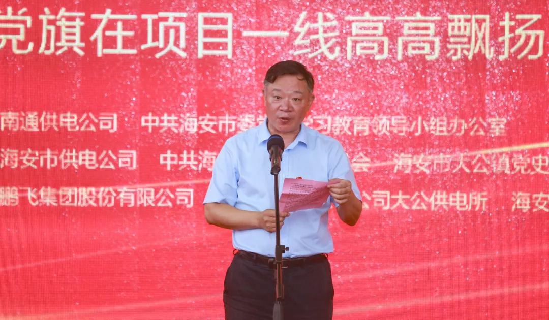 國網(wǎng)南通供電公司副總經(jīng)理李秋實,海安市委常委、宣傳部部長王榮貴,海安市委組織部副部長、“兩新”工委書記吳蘭,海安市委宣傳部常務(wù)副部長劉萬春,海安市委宣傳部副部長、新聞出版局局長陳琳,國網(wǎng)海安市供電公司總經(jīng)理唐玉婷,海安市發(fā)改委黨組成員、工信局專職副局長陳皞,鵬飛集團黨委書記、董事長王家安,大公鎮(zhèn)黨委書記金山存,大公鎮(zhèn)黨委副書記、鎮(zhèn)長魯競共同啟動“黨旗在項目一線高高飄揚”活動。