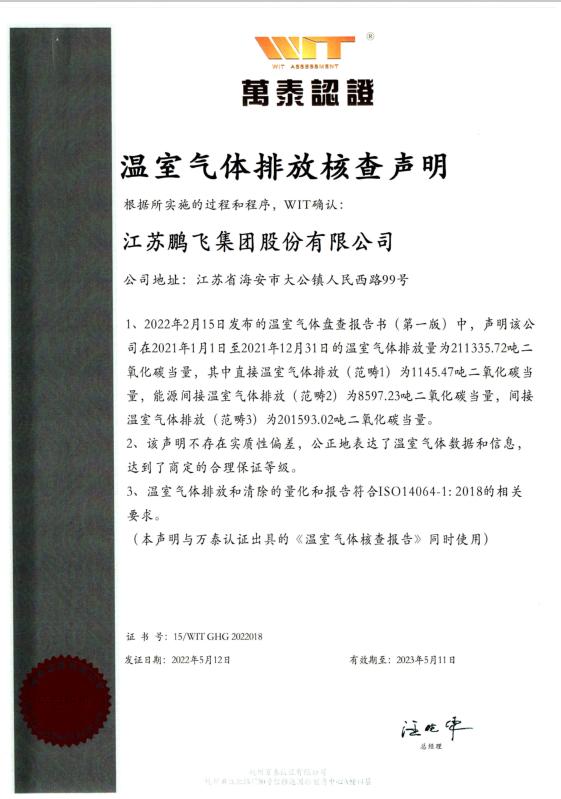 江蘇鵬飛集團股份有限公司一直以來堅持綠色采購,綠色生產(chǎn),綠色物流的原則,積極響應(yīng)并參與相關(guān)方(政府、客戶等)節(jié)能降排、碳排放報告活動。
