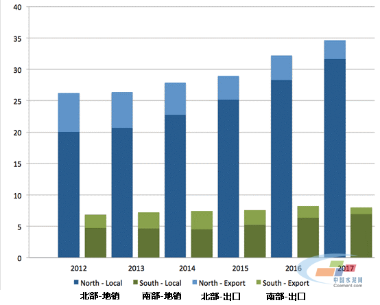 上圖展現(xiàn)了巴基斯坦國內(nèi)水泥行業(yè)的現(xiàn)狀,巴基斯坦的年度水泥消費量從2012年的3310萬噸增長到了2017年的4280萬噸,增長幅度在30%左右,其中五分之四的水泥消費集中在巴基斯坦的北部地區(qū)。與此同時,更重要的是,巴基斯坦的出口水泥從2013年的830萬噸降低到了2017年的420萬噸。造成這一現(xiàn)象的主要原因是阿富汗市場的下跌,以及水性熟料出口量的減少??紤]到南方市場的出口水泥比例較高,盡管水泥總消費量在增長,但是出口量的減少對南方可能會造成更大的打擊。2018年到目前為止,類似的趨勢依然存在,唯一有所改變的是南方熟料出口量的在今年有反彈的跡象。