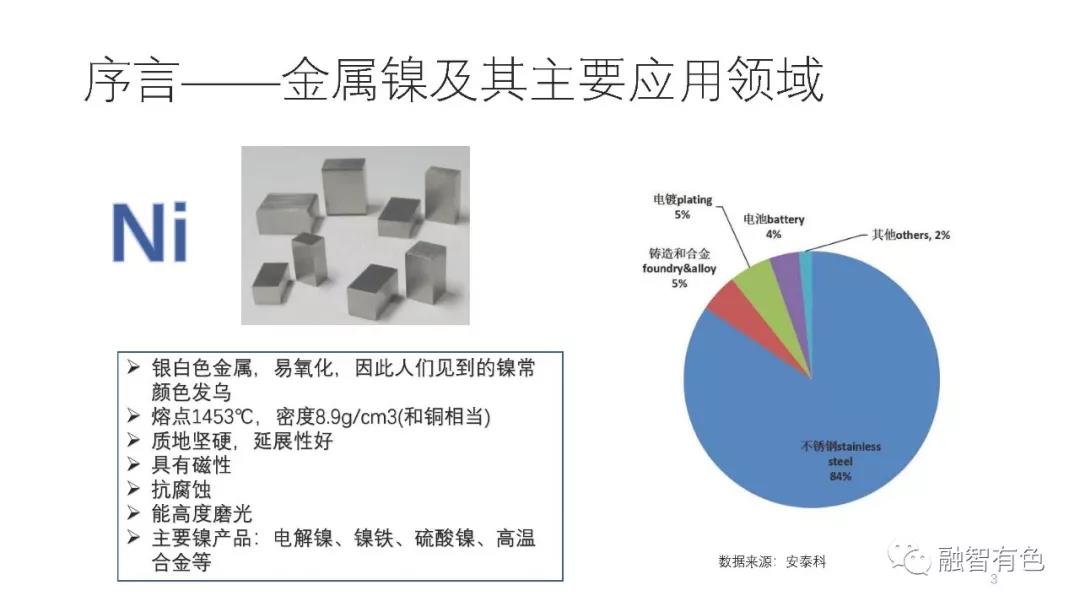 按:金屬鎳是一種性質(zhì)優(yōu)異的基礎(chǔ)金屬,在不銹鋼、電鍍、鑄造及合金、動(dòng)力電池等領(lǐng)域廣泛。特別是近年來(lái)由于新能源汽車(chē)長(zhǎng)續(xù)航里程的要求,使得高鎳三元?jiǎng)恿﹄姵厥艿酱蠹业臉O力熱捧,由此又帶動(dòng)了鎳在新能源領(lǐng)域的高速增長(zhǎng),為鎳的應(yīng)用再次錦上添花。