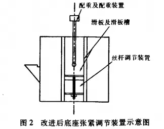 原來設計的配重裝置采用兩邊齒條,通過配重和下滾筒的自重進行皮帶張緊,兩邊調(diào)節(jié)裝置同時調(diào)節(jié)皮帶的跑偏情況。從理論上講沒有問題,但實際使用中皮帶兩邊跑偏嚴重,無法進行調(diào)整,增大配重或偏向提升或下沉齒條都無法解決問題。經(jīng)研究分析,我們將配重連接M32的絲桿,在導向板的下半部分設置調(diào)節(jié)裝置,解決了問題。改進前后見圖1、圖2。