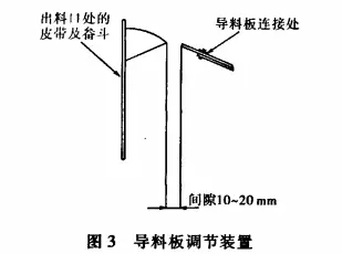 由圖3可見,間隙應調(diào)整在10-20mm,不能太大,也不能太小。間隙太小,機組運行時,畚斗與導料板相碰,無法運行。間隙太大,則回料太多,導致機組箱體內(nèi)堵料而停車。導料板系易損件,平時應經(jīng)常檢查導料板的磨損情況,做到及時更換,并保證安裝牢固。