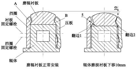 利用庫滿停機(jī)檢查,發(fā)現(xiàn)有一塊磨輥襯板的2條固定螺栓松動(dòng),緊固螺栓后用撬杠仍可以撬動(dòng)襯板。此時(shí)分析認(rèn)為可能是這塊襯板與輥體接觸面處出現(xiàn)較大磨損、變形,襯板固定不牢固。用塞尺測量接觸面A、B處間隙,B處接觸面符合要求,A處有5mm間隙。拆開襯板后發(fā)現(xiàn),該襯板下面的輥體磨去10mm左右,輥體在靠擋圈側(cè)及壓板側(cè)分別形成寬約5mm及25mm的翻邊(見圖1中翻邊1及翻邊2)。其他11塊襯板及對應(yīng)的輥體正常。由上述檢查可知,輥體表面的磨損及翻邊造成了襯板固定不牢固。