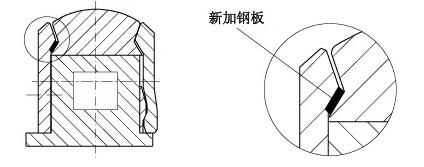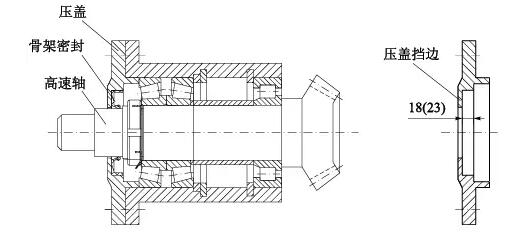 骨架密封厚度15mm,拆下壓蓋用車床將骨架密封擋邊車薄5mm,壓蓋密封槽深度由18mm加深到23mm(見圖4)。此法使得骨架密封在高速軸上的安裝位置向外移動(dòng)5mm,避開高速軸上的溝槽。經(jīng)此處理,解決了漏油問題,可以正常生產(chǎn),等到計(jì)劃檢修停機(jī)時(shí),再徹底處理高速軸上的溝槽。