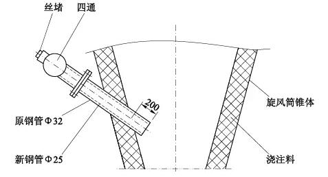 常規(guī)解決方法是打掉原Φ32鋼管周圍澆注料后更換原Φ32鋼管,這需要長時(shí)間停窯。我們采取了應(yīng)急處理: