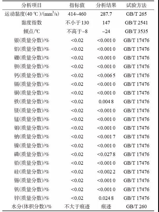 現(xiàn)場檢查發(fā)現(xiàn),磨輥腔體內(nèi)部油品發(fā)黑、油品黏度較低,現(xiàn)場對油品取樣進行分析,結(jié)果如表1所示。由表1可以看出,該牌號油品40 ℃正常的運動黏度應(yīng)該在460 mm2/s,實測值為287.7 mm2/s,水分超標,潤滑油本身碳化嚴重,品質(zhì)下降,鐵與鋅雜質(zhì)含量增加。從分析結(jié)果判斷,該型立磨使用的油品已不滿足磨輥軸承正常運行所需要的油品條件。
