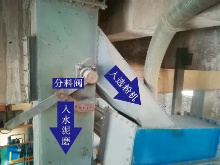 圖3 兩路分料閥3 試驗步驟(1)在設(shè)備運行穩(wěn)定、產(chǎn)質(zhì)量正常情況下,出V型選粉機微粉全部入磨機,即以聯(lián)合粉磨方式為基準(zhǔn),簡稱為試驗1;
