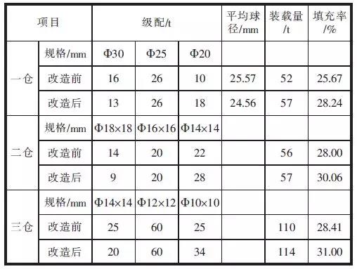 表2 改造前后磨內(nèi)研磨體級配情況