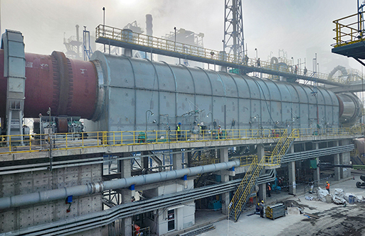 轉(zhuǎn)化焙燒:鋰輝石精礦從精礦庫人工送至斗式提升機(jī)提升至精礦倉,再經(jīng)圓盤給料機(jī)和螺旋給料機(jī)加入碳酸鋰回轉(zhuǎn)窯窯尾,利用窯尾預(yù)熱段高溫氣體干燥精礦,精礦在煅燒段約1200℃左右的溫度下進(jìn)行晶型轉(zhuǎn)化焙燒,由α型(單斜晶系,密度3150kg/m3)轉(zhuǎn)化為β型鋰輝石(四方晶系,密度2400kg/m3,即焙料),轉(zhuǎn)化率約98%。